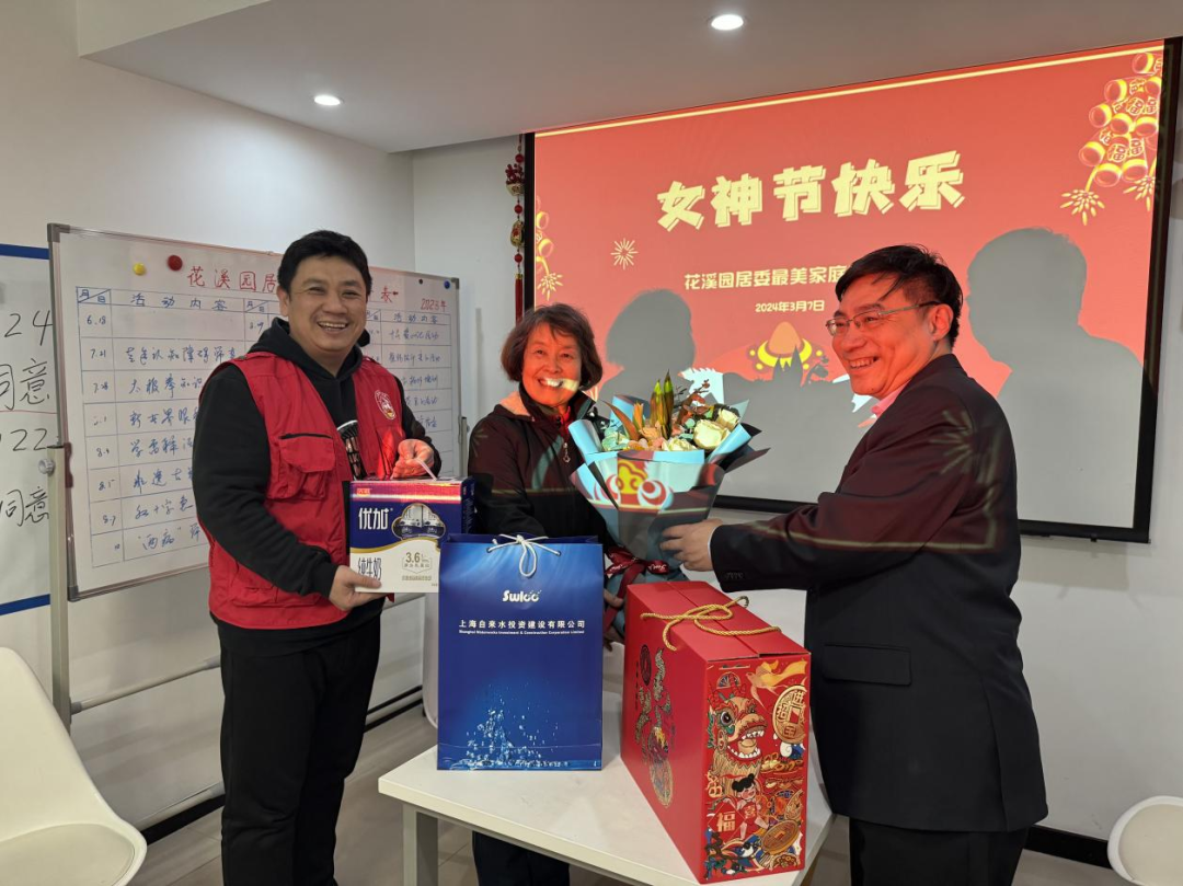 3月7日下午,上海自来水工会主席蔡天虹代表公司走访公司属地街道花溪园居民区,为“海上最美家庭”及区内女